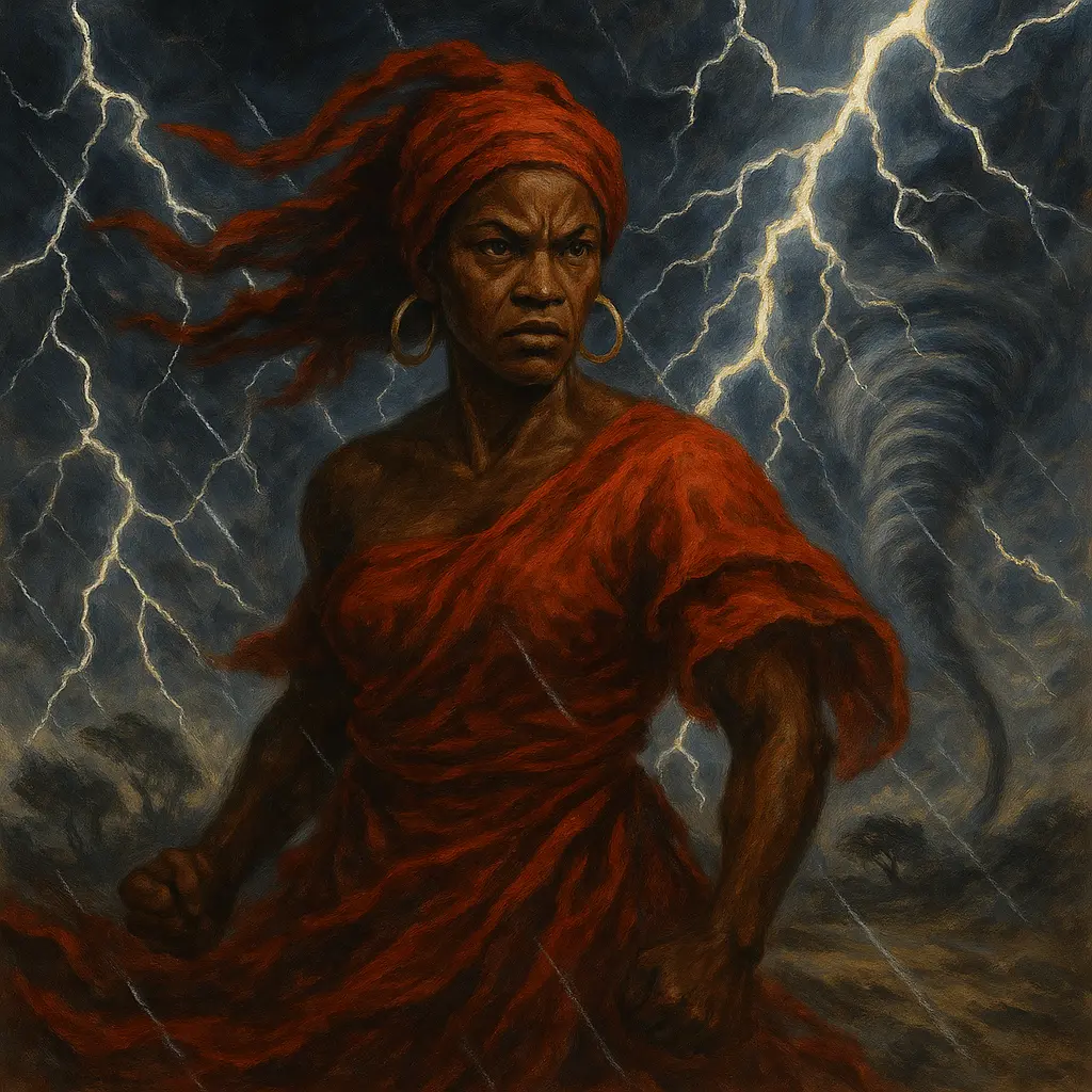 Desde então, ninguém controla o vento sem passar por Oyá. Ela sopra o efunfun, o vento branco, frio, que purifica e o eru, o vento quente e veloz, que destrói o que precisa ser transformado. Quando o redemoinho surge, dizem: “Oyá está dançando”. Mas sua dança não é punição é revelação. Oyá mostra o que foi negligenciado, expõe as feridas do descuido humano e anuncia o tempo da mudança.